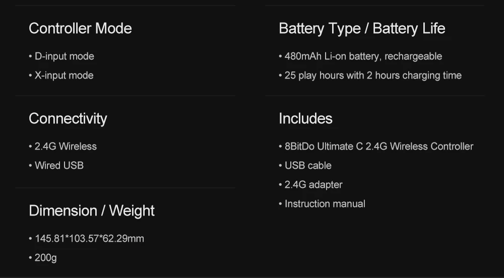 - Inclusions: Wireless Controller, USB cable, 2.4G adapter, manual