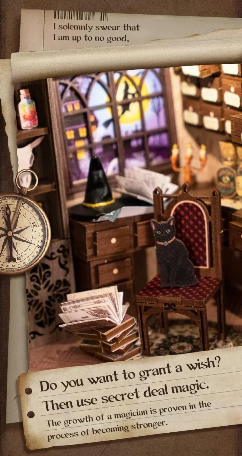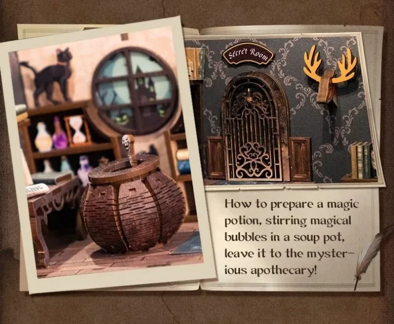 - Features intricate details like a crucible, potion bottles, a secret room, a black cat, magic books, and a broom.